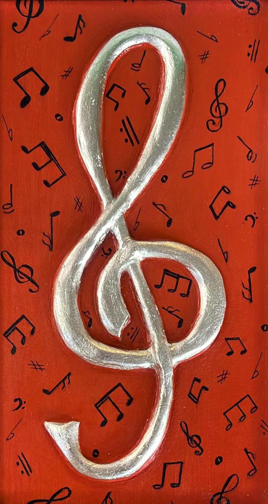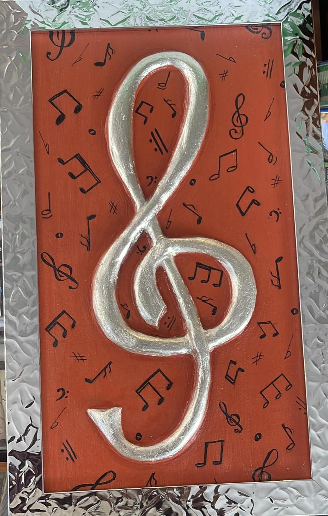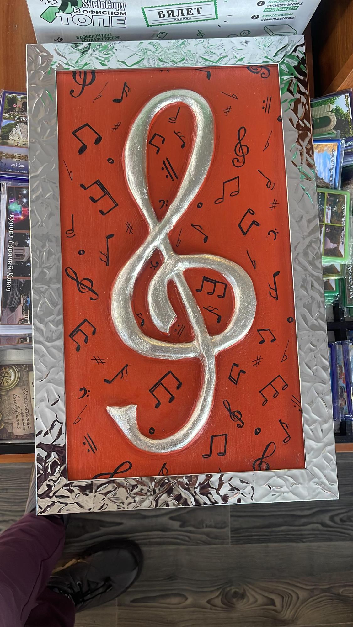 Скрипичный ключ выполнен текстурной пастой. Работа окрашена акриловыми красками. Сам ключ сверху покрыт поталью цвета шампань. Сверху вся работа покрыта матовым лаком. Картина одета в Красивую раму.
