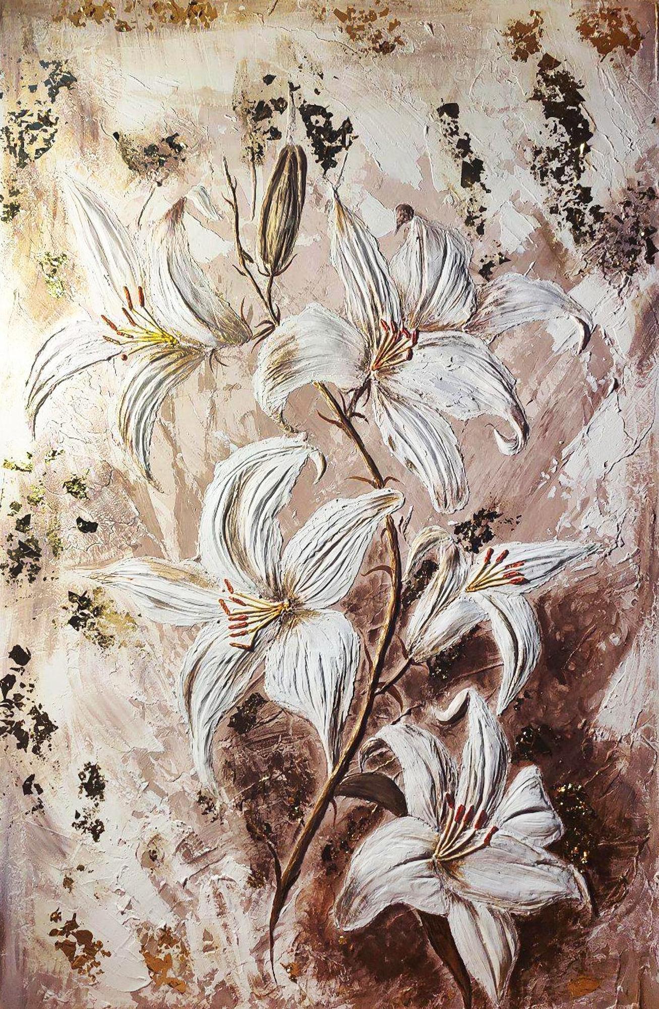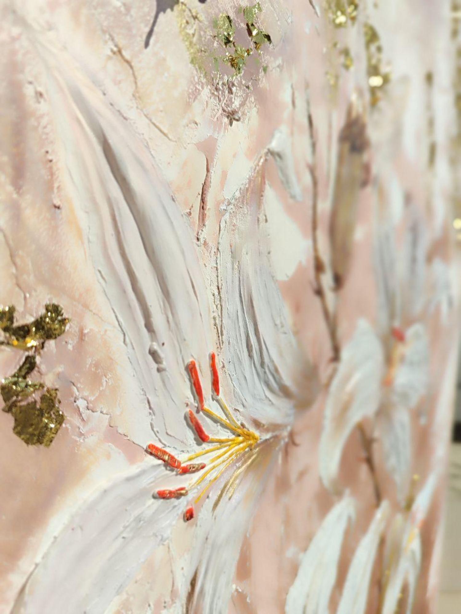 Картины с лилиями на холсте, выполненные шпатлёвкой и акриловыми красками, рождаются на стыке живописи и рельефа — это не просто изображение.Шпатлёвка придаёт лилиям объём, фактуру и ощущение прикосновения, а акрил наполняет их светом, глубиной и чистотой цвета.