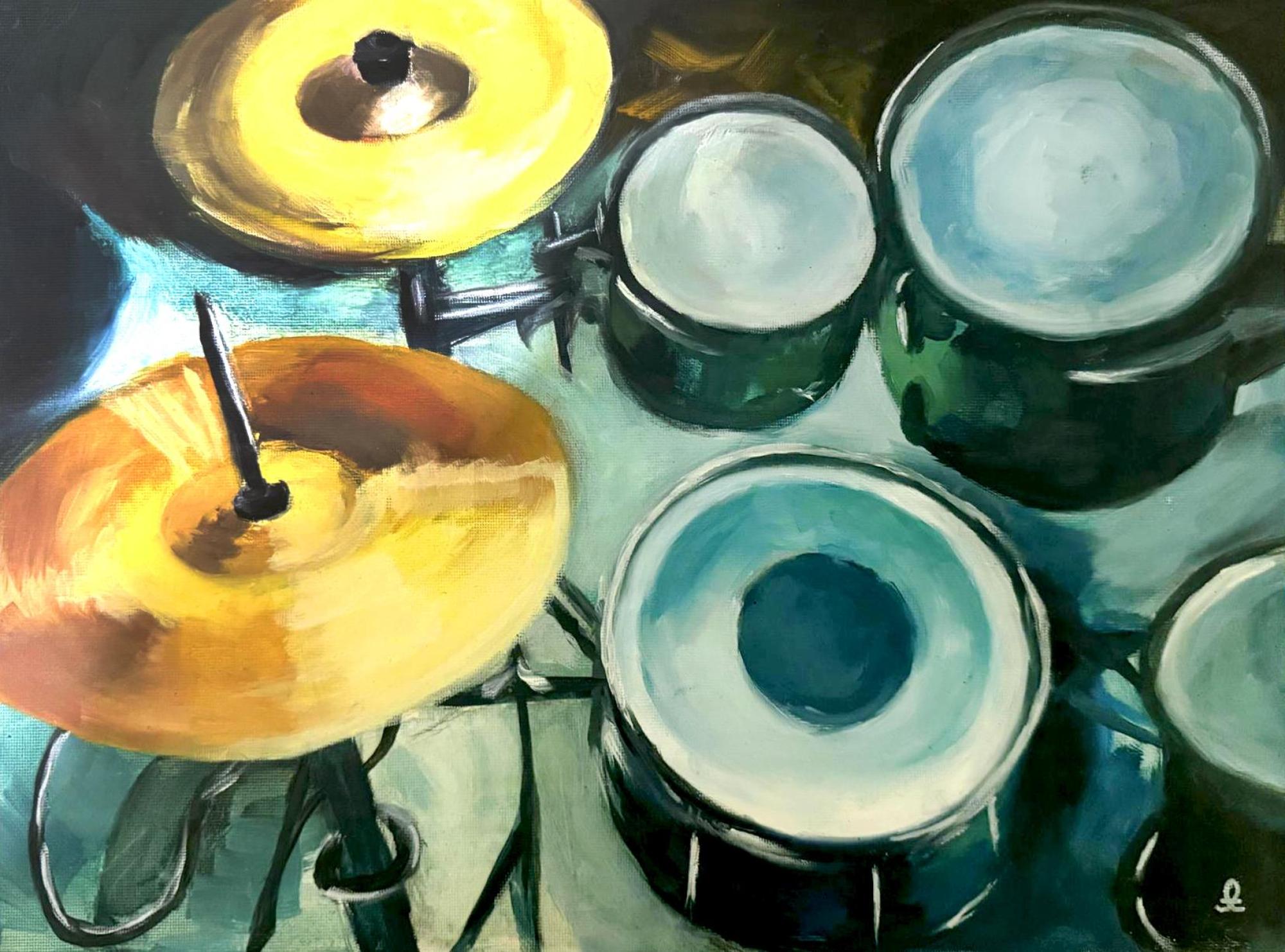 На картине нарисована барабанная установка, выполненная в стиле, близком к постимпрессионизму с элементами экспрессионизма. Это синтетический стиль, где постимпрессионистская работа с цветом и мазком сочетается с экспрессионистской свободой в трактовке формы. Такой подход позволил мне, как художнику, не просто изобразить барабаны, а передать их «характер» и энергетику через цвет и композицию. Картина выполнена маслом на картонной основе и покрыта матовым лаком.