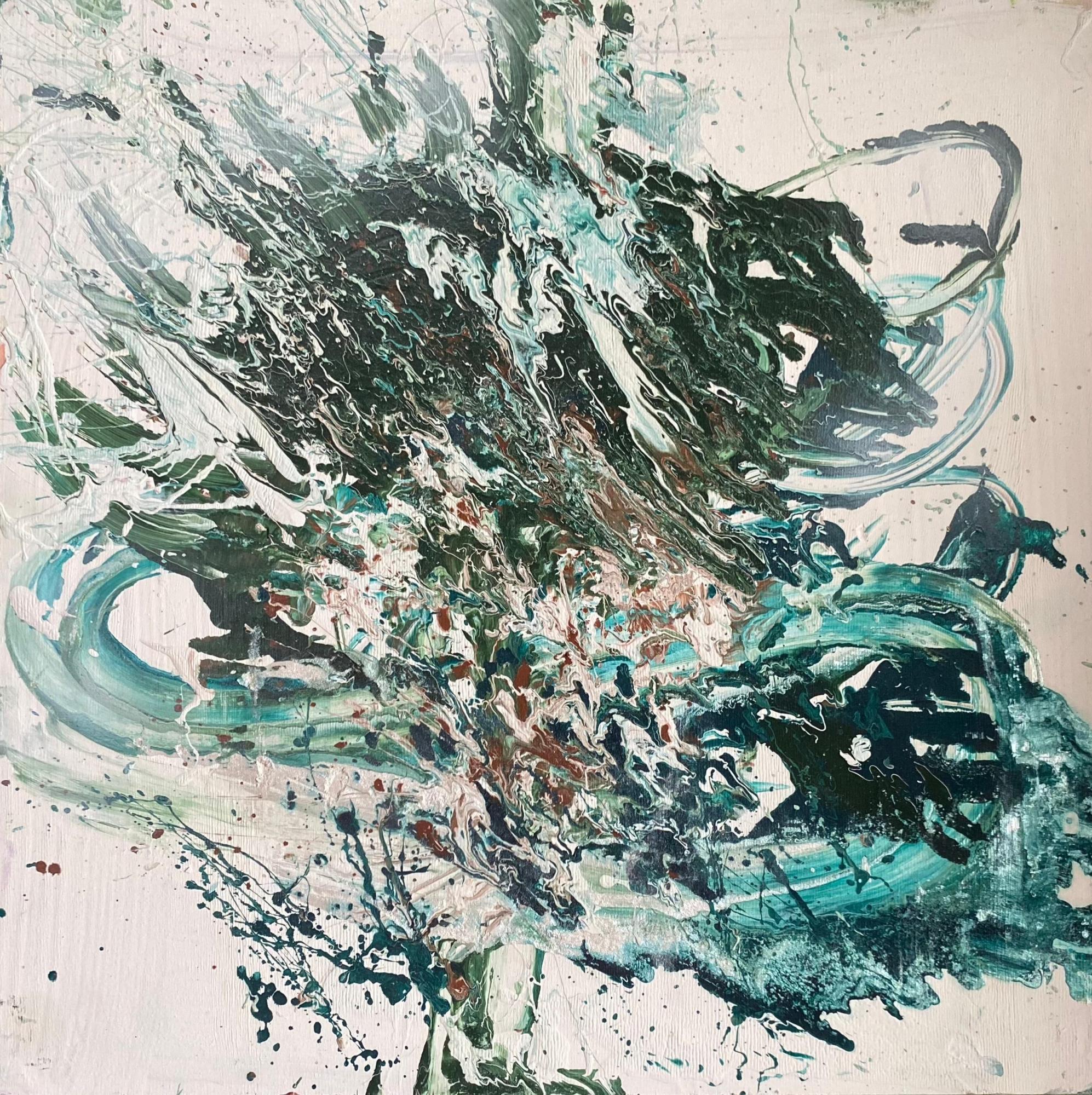 Работа перекликается с традициями абстрактного экспрессионизма (Jackson Pollock, Willem de Kooning), где главное — не изображение объектов, а выражение эмоций, состояния души через спонтанность, жестикуляцию, работу с материалом. При этом автор находит собственный голос, сочетая экспрессию с определённой структурностью композиции.