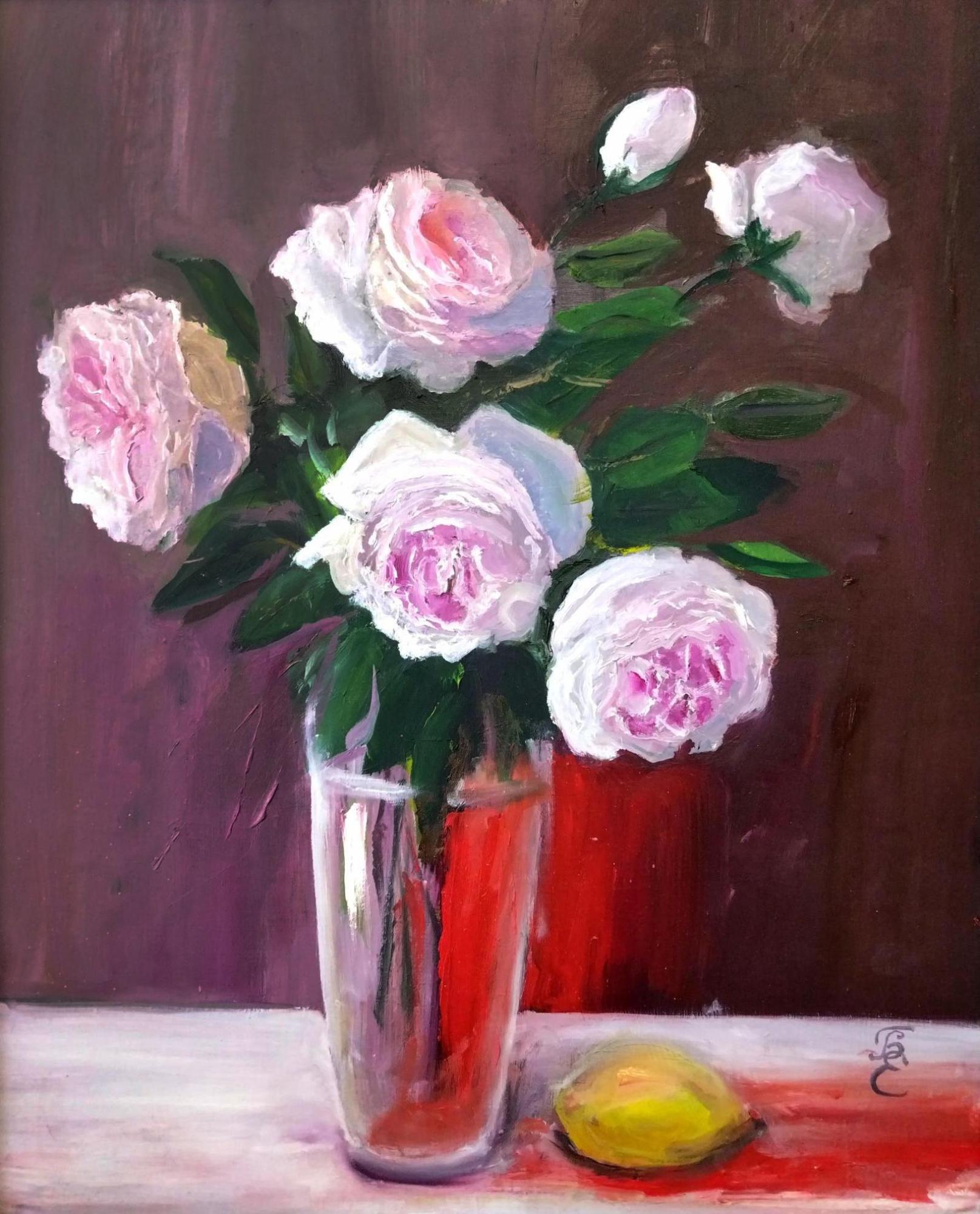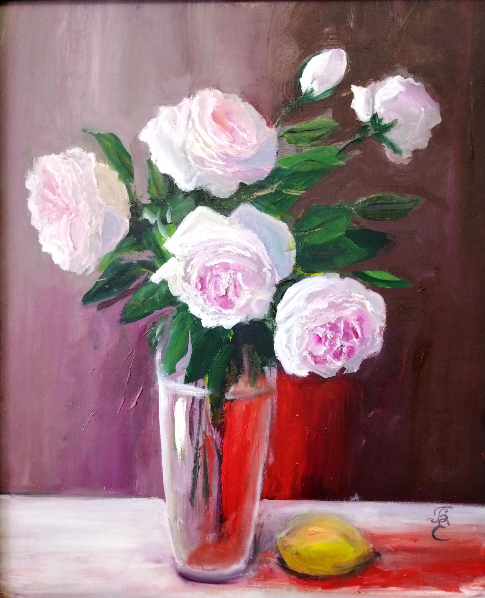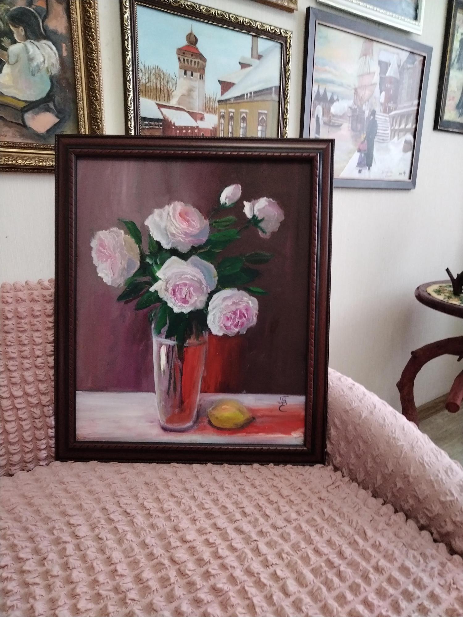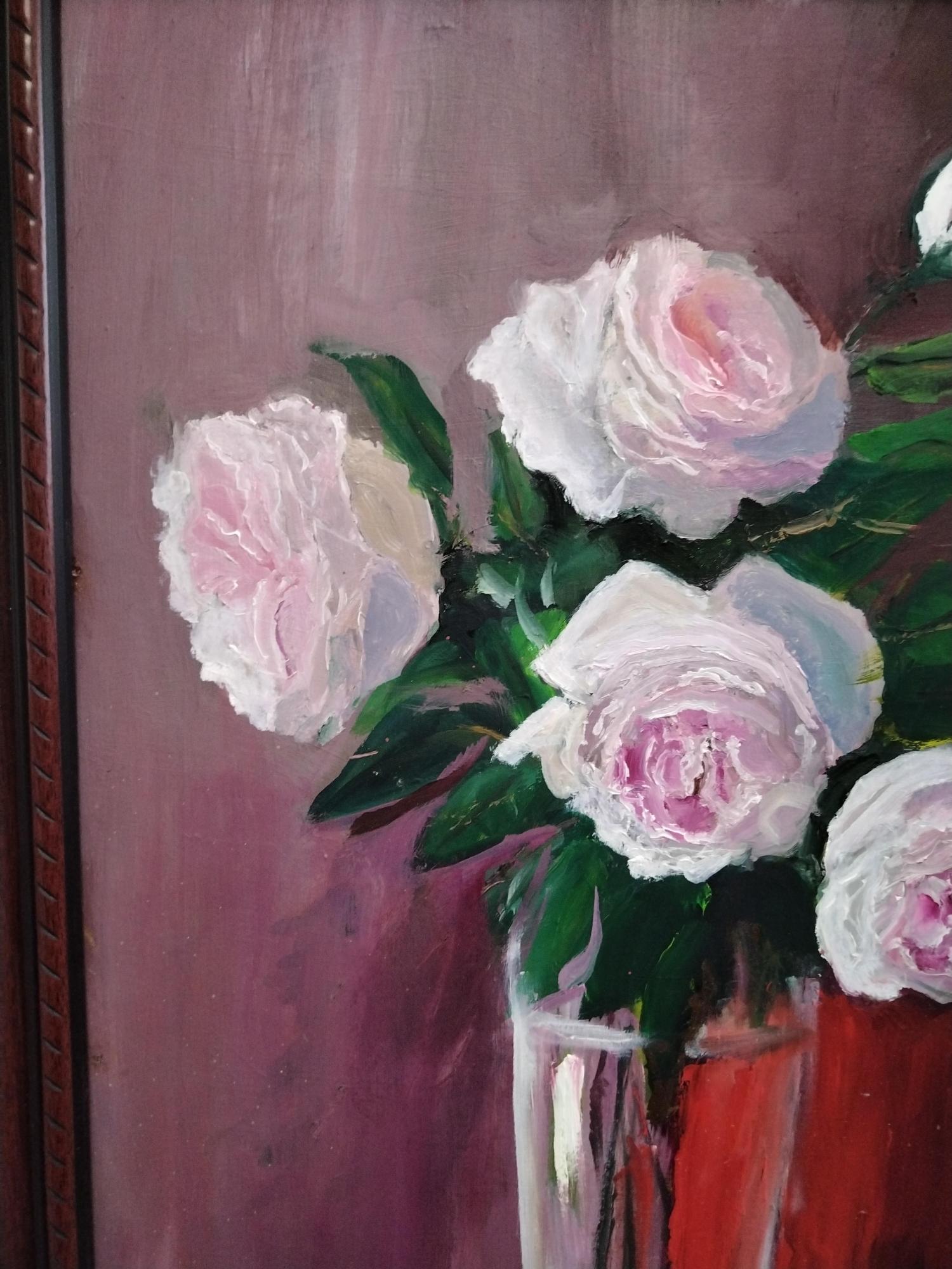 Эта работа никого не оставляет равнодушным. Розы расцветают под Вашим взглядом. Красота цветов торжественна. Повышает настроение. Отлично вписывается в интерьер. Размер картины 50х40.Выполнена масляными красками на оргалите.