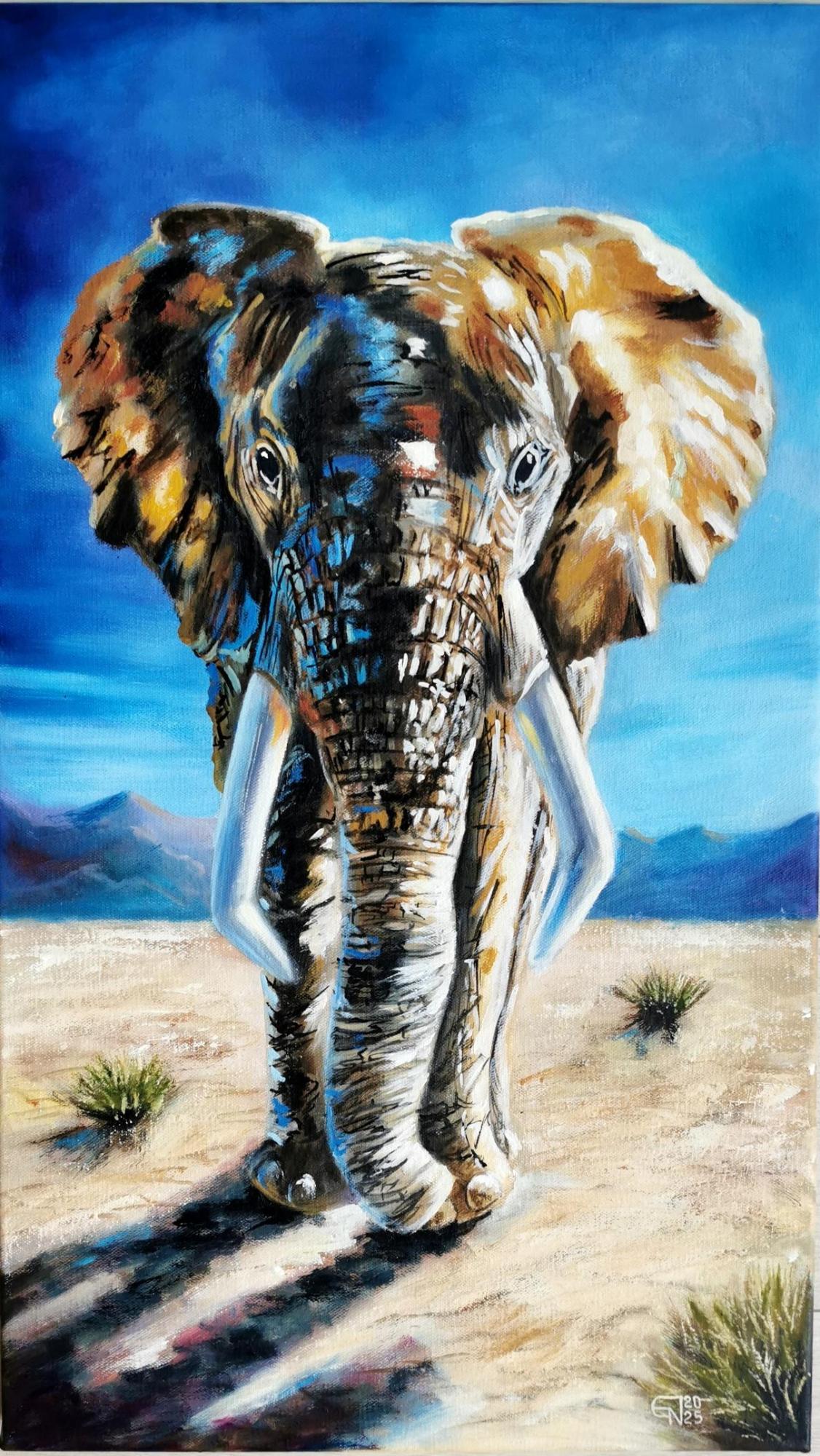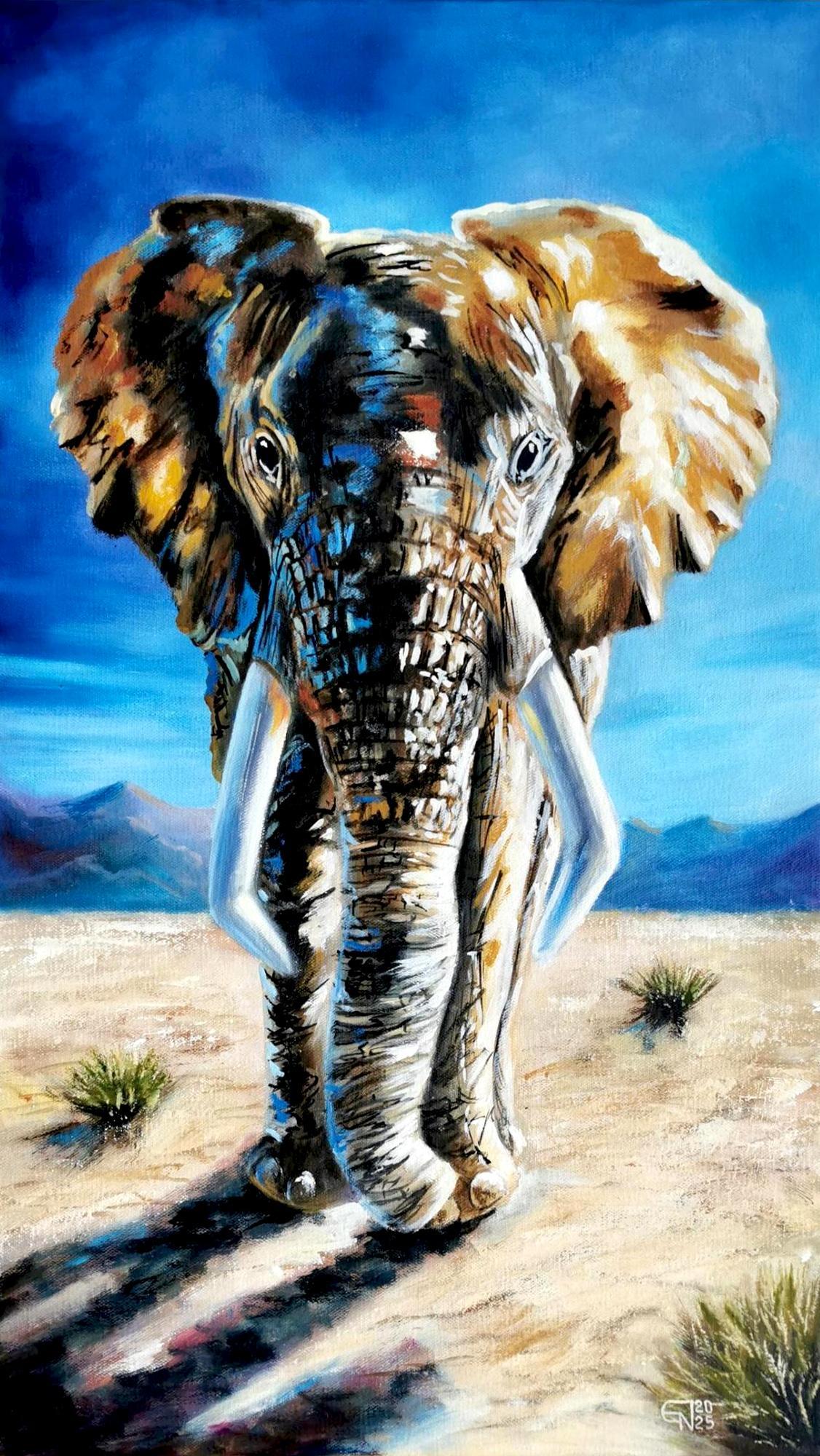 Перед зрителем — величественный африканский слон, медленно и уверенно идущий по бескрайней саванне. Мощная фигура животного, выразительные бивни и фактурные мазки создают ощущение силы, свободы и природной гармонии.