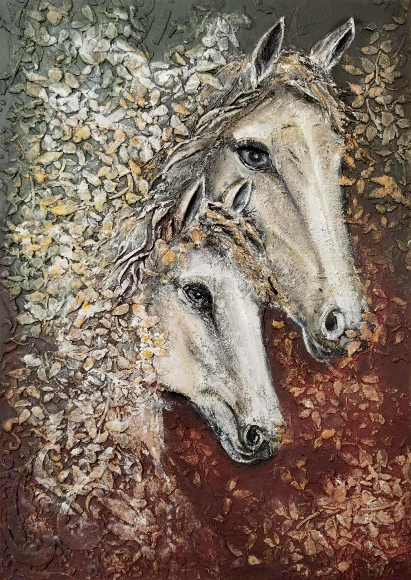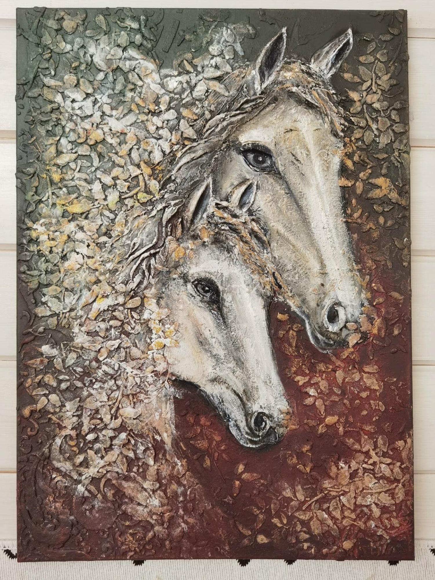 Картина "Белые лошади" выполнена в смешанной технике на холсте, с помощью текстурной пасты, акрила.