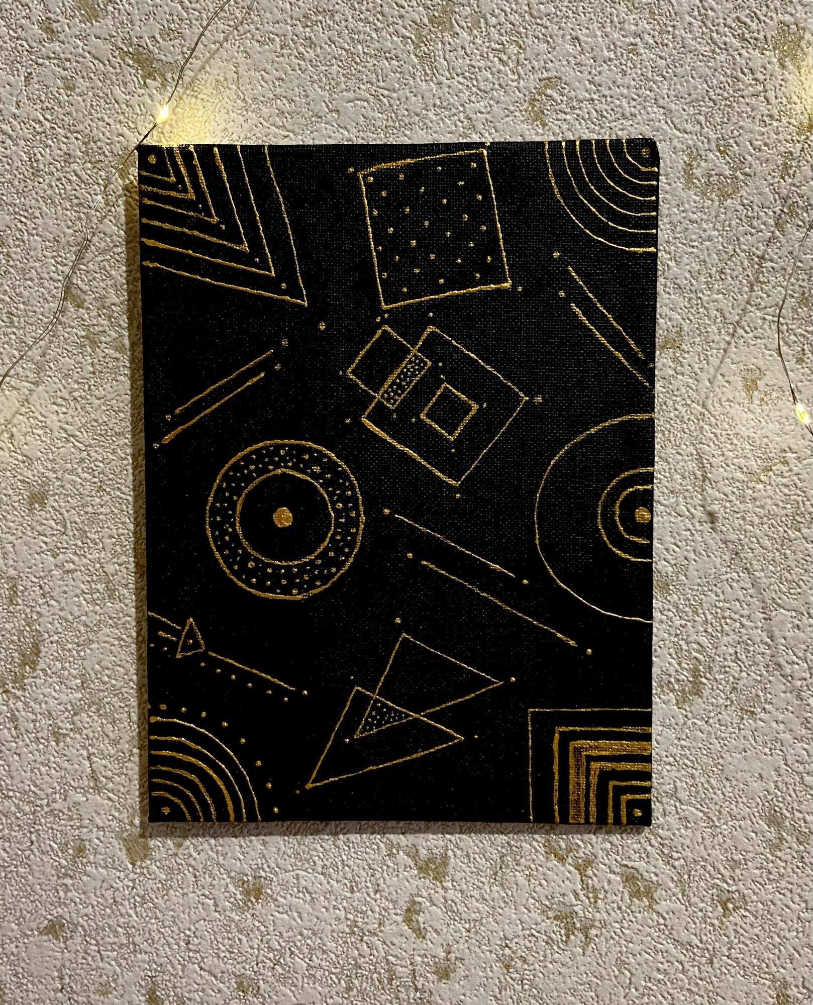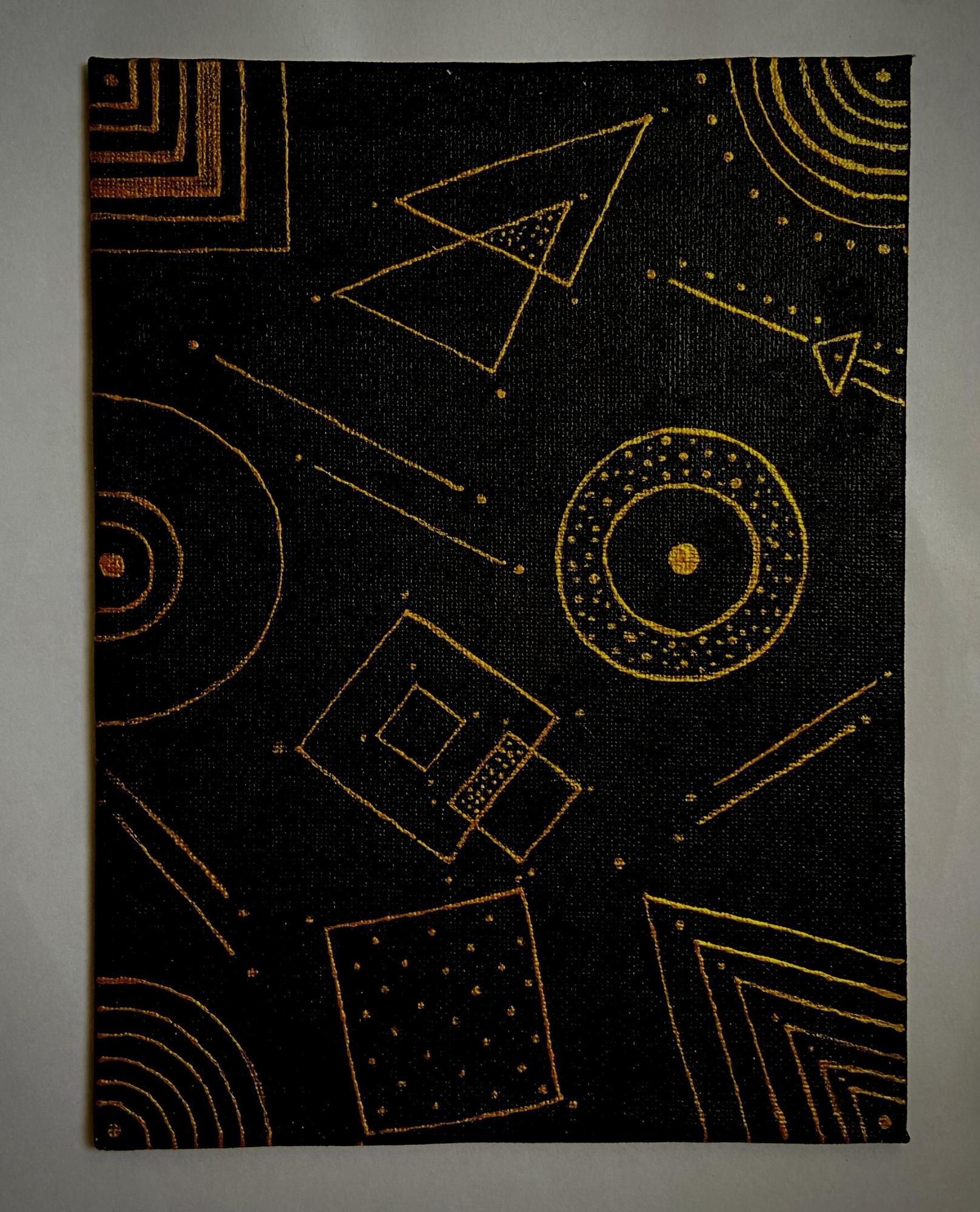 Геометрические формы — от строгих линий до сложных пересечений — создают визуальный ритм, который воспринимается как современный зашифрованный код или медитативная карта пространств.