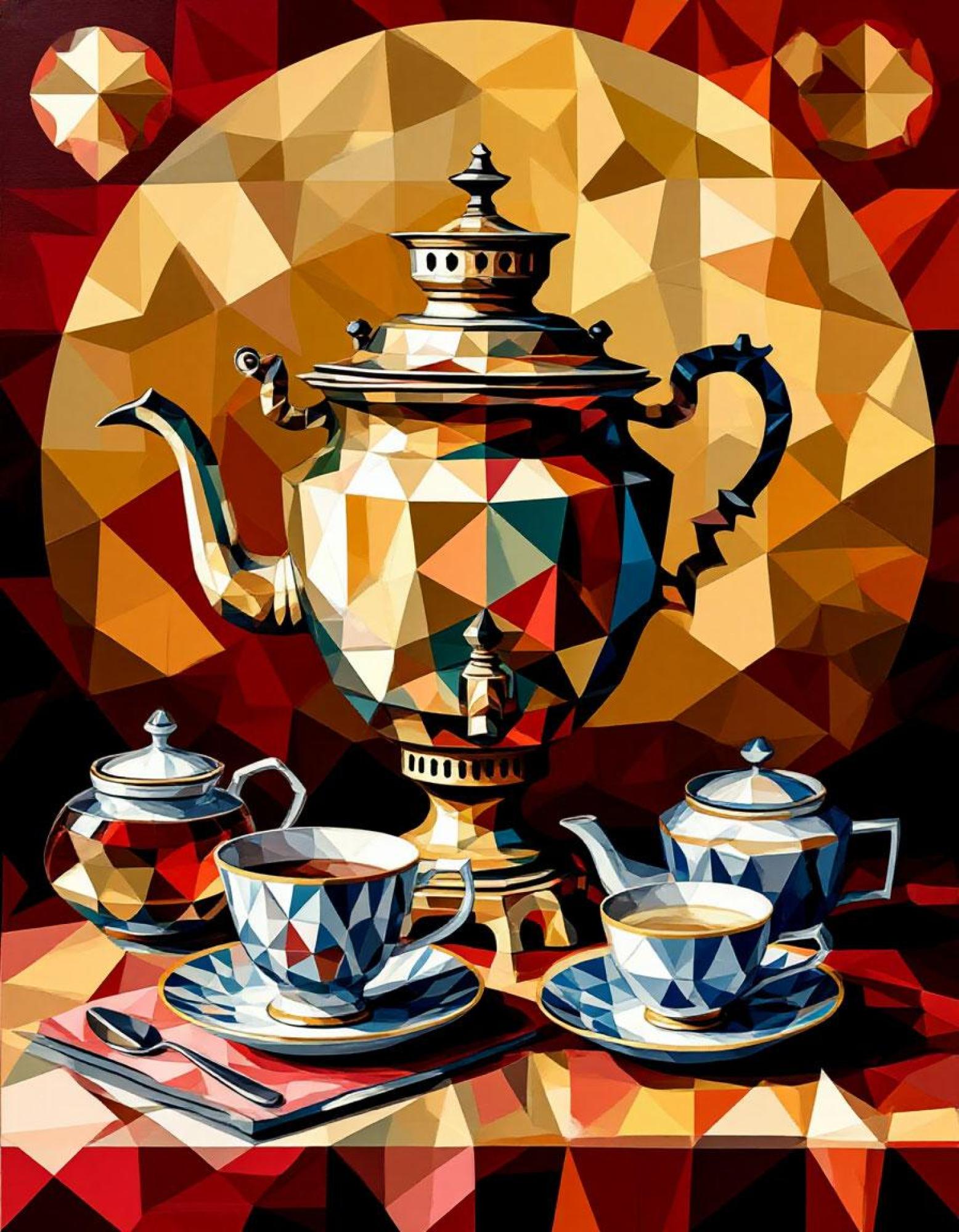 Один из основателей живописного течения в России как кубофутурист - Давит Бурлюк был фигурой противоречивой , сложной , широкой и жадной до всего нового. Он постоянно эксперементировал , не стеснялся менять свой художественный стиль, переходя от импрессионизма к народному искусству, вплетая в свои полотна элементы кубизма. Уехав из революционной России он стал первооткрывателем нового искусства в Японии , а позже и в США где он в 1954 году и написал картину ,, Чаепитие с самоваром ,, . Автор предлагает нам представить себе футуристический самовар внутри которого установлены инновационные нагревательные элементы , позволяющие обеспечивать равномерное закипание и наслаждаться ароматом чая который можно выбрать по своему усмотрению. Но самое главное - этот самовар сохраняет дух традиций он объединяет в себе лучшее из мира прошлого и мира будущего в совместном чаепитии.