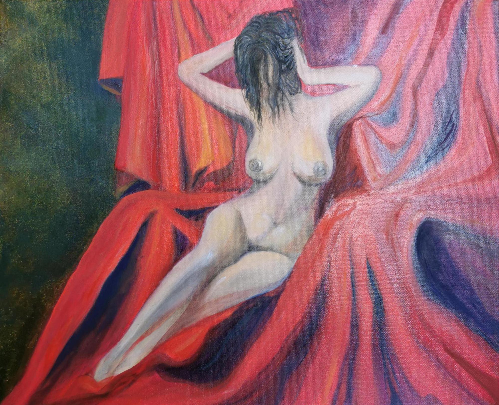 На картине позирует фактурная натурщица, игриво закрывая лицо волосами. Пышная, обнажённая грудь особо привлекает зрителя.