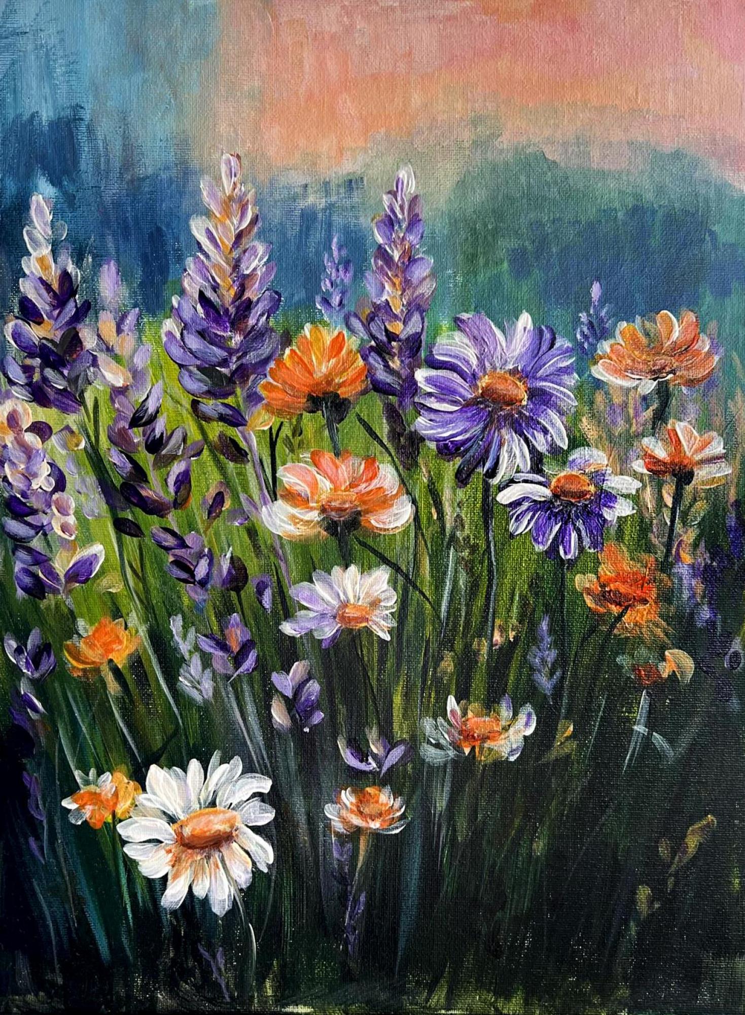 Фон картины — настоящий шедевр игры света и тени. Мягкие переходы от глубокого синего к нежно-розовому создают иллюзию утреннего неба, только что омытого росой. Лёгкая размытость линий придаёт работе воздушность, позволяя зрителю мысленно шагнуть в этот пейзаж, вдохнуть аромат полевых трав и почувствовать свежесть раннего утра. Техника исполнения поражает: сочные, насыщенные цвета сочетаются с деликатными полутонами, а выразительные мазки придают текстуре холста особую глубину. Эта работа — не просто изображение цветов, а эмоциональный портрет природы, способный пробудить в зрителе тёплые воспоминания о лете, свободе и безмятежности.