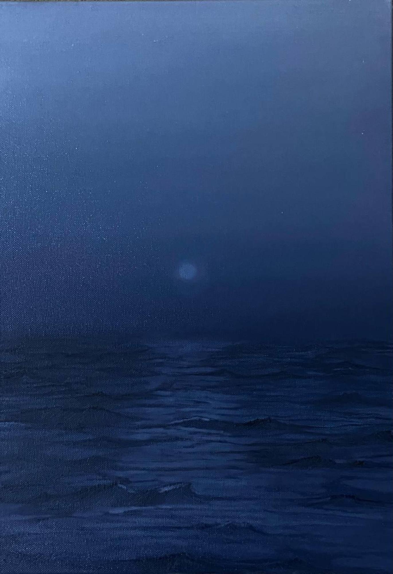Это живописное полотно, погружающее зрителя в атмосферу глубокой ночи и безграничного моря. Картина выполнена преимущественно в синей гамме — от насыщенных индиго и темно-синих тонов до едва уловимых серебристо-голубых отблесков, создавая ощущение холодной, спокойной и одновременно загадочной ночи.