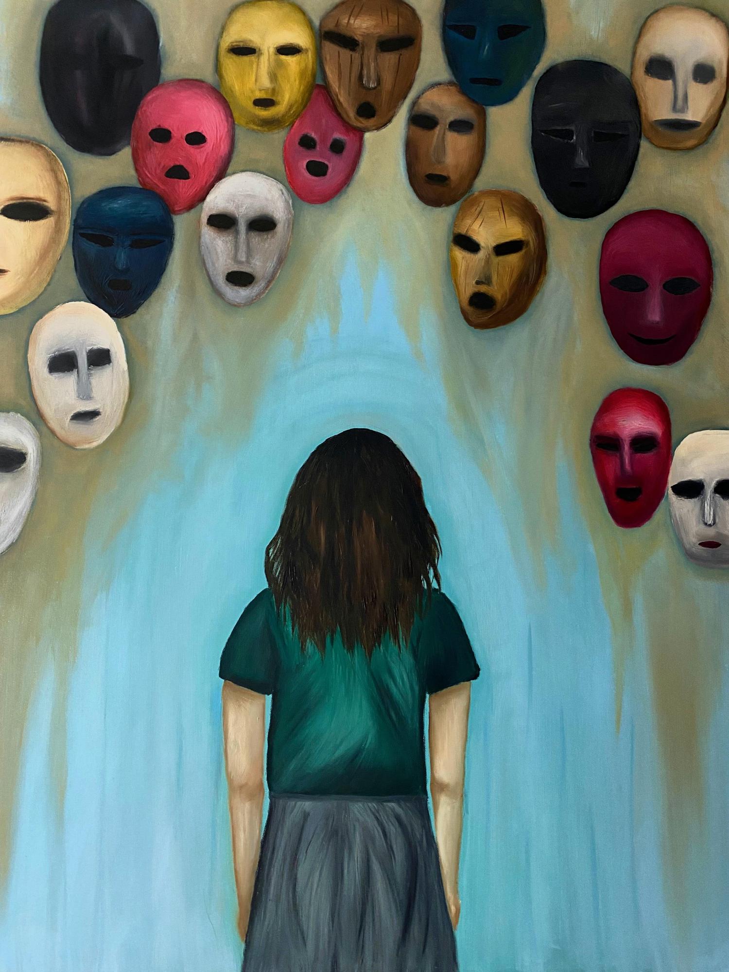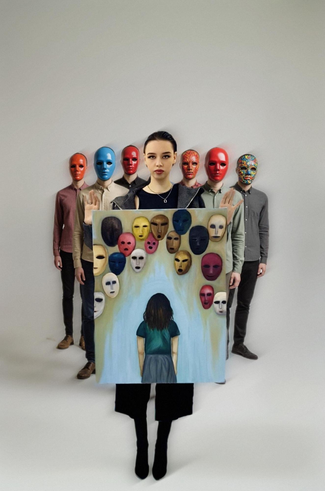Картина выполнена в реалистичной манере и со вниманием к деталям — акценты и выразительность взгляда масок создают живое впечатление присутствия.