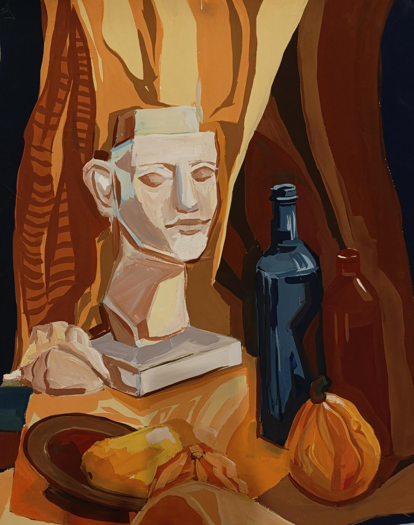 Натюрморт исполнен в стилизованной манере, где особое внимание уделено выразительности контуров и игре палитры, тогда как четкость форм и реалистичность сознательно смягчены.